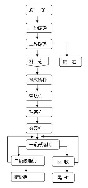 對(duì)礦石進(jìn)行粉碎采用的是破碎機(jī),常用的是鄂破、反擊破和錘破等,一般經(jīng)過兩次破碎,通過篩選來進(jìn)行是否進(jìn)行破碎,同時(shí),配合的設(shè)備還有給礦設(shè)備,然后送入到球磨機(jī)磨粉,磨粉后進(jìn)行分級(jí),分級(jí)后可用來選礦。對(duì)磁鐵礦選礦通常采用的是磁選機(jī),通過礦石的磁力不同,經(jīng)過磁選機(jī)發(fā)出的磁場(chǎng)時(shí)候,表現(xiàn)出不同的動(dòng)作,選擇出我們需要的精礦。